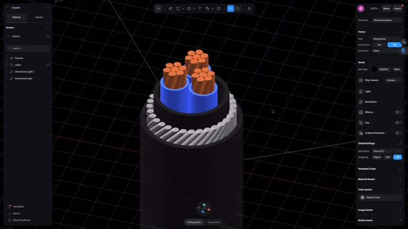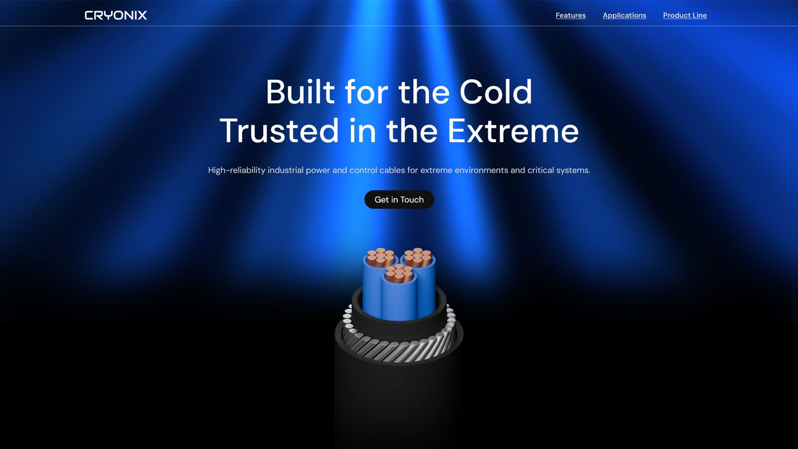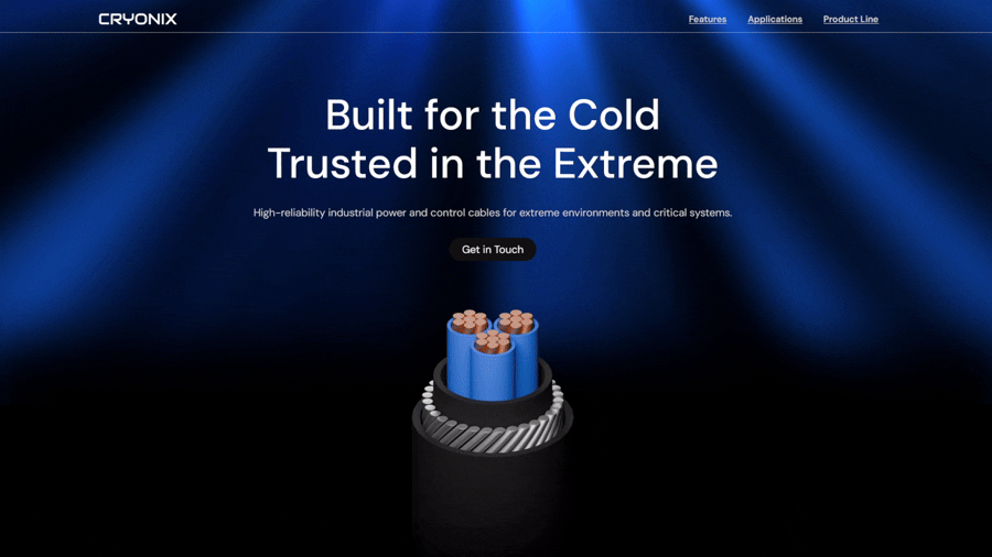 Cryonix is a conceptual industrial cable brand created as an exploration of product storytelling, interaction design, and 3D-driven web experiences. The project focuses on communicating the internal structure and performance of industrial cables designed for extreme environments through an interactive, scroll-based website.