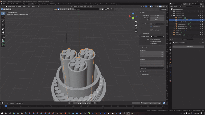The cable model was designed to balance visual clarity with technical plausibility. While not intended as a manufacturing-accurate engineering model, the structure reflects real-world cable construction principles such as layered insulation, shielding, and stranded conductors.